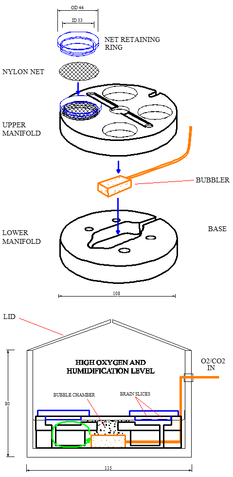 Schematic arrangement of BSK5-4 and location in purpose designed trough with conical profiled lid. Profile shows two of the four rings in cross section. Oxygen bubbles rise in the center carrying aCSF up and across beneath the surface of the slices, solution is re-directed towards the bubbler to create continuous circulation (green arrow). Approximate dimensions are in mm.