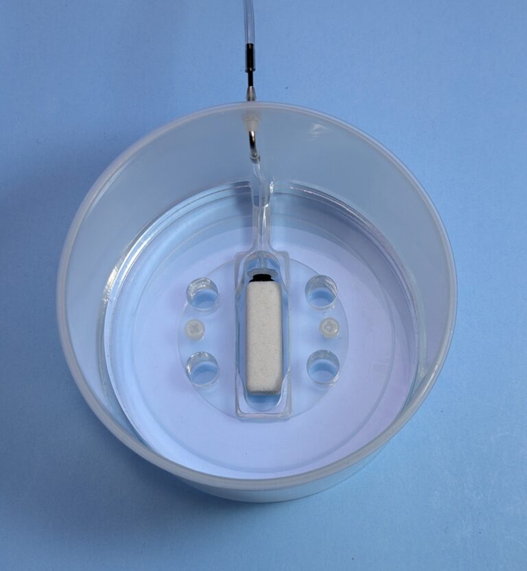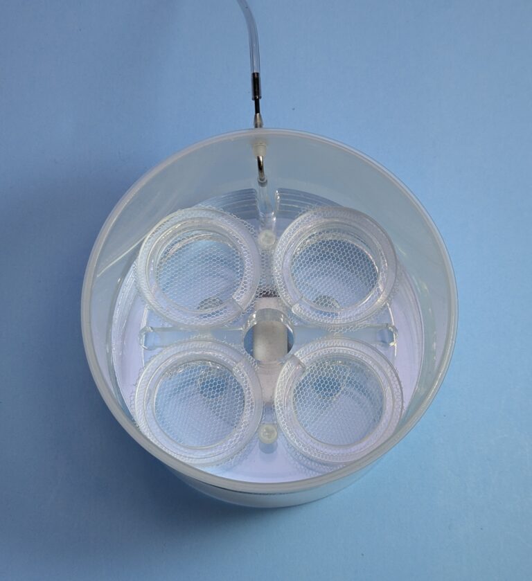 The BSK5-4 Brain Slice Keeper has been designed to pre-incubate a large number of brain slices prior to transfer into recording chambers. Based on the BSK4, it consists of four closely fitting acrylic rings, installed into four holes on an upper manifold. The close fitting rings allow a removable sheet of nylon netting to be wedged and held in place. In this slice keeper, the slices can optionally be maintained either at an interface between the incubation medium and a humidified, high oxygen atmosphere within the holding vessel or fully submerged. Furthermore the slices can be maintained on a flat porous membrane (eg *Millicell-cm, 0.4um Cat.# PICMORG50 from Millipore) placed on the nylon netting in order to maintain the underside of slices perfectly flat for subsequent experiments utilizing microscope techniques.